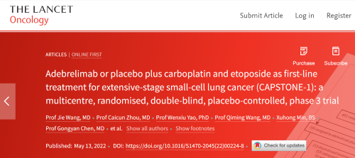 北京时间2022年5月14日,AG视讯医药自主研发的PD-L1抑制剂阿得贝利单抗治疗广泛期小细胞肺癌的III期临床研究(CAPSTONE-1研究)成果正式全文在线发表于国际权威学术期刊《柳叶刀·肿瘤学》(《THE LANCET Oncology》,影响因子41.316)。CAPSTONE-1研究结果显示,阿得贝利单抗联合化疗一线治疗广泛期小细胞肺癌相较于安慰剂联合化疗可以显著延长患者总生存期至15.3个月[1],刷新现有免疫药物一线治疗广泛期小细胞肺癌的总生存纪录[2]。